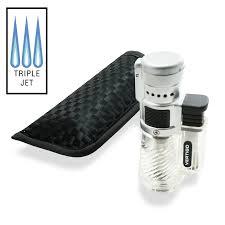 Cyclone Vertigo triple wind resistant torch lighter. Black and Clear fuel tank, adjustable flame. Comes in cloth pouch